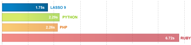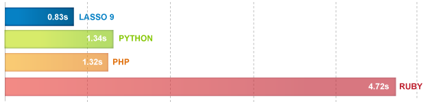 String manipulation and math operations are the heart of almost every programming task. And the core purpose of programming languages like Lasso is to perform these processes as quickly as possible. Thanks in part to its new LLVM core and native compilation, common speed tests show how Lasso 9 outperforms the competition.
